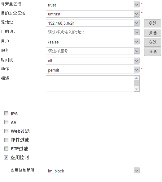 2. 配置允许市场部员工上网,并阻断IM应用的转发策略。