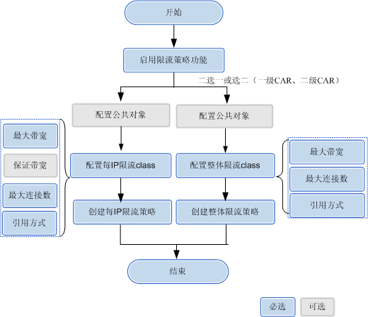 限流策略的配置流程如图7-37所示,可根据实际场景配置(一级CAR、二级CAR),或者二者都配置,来对流量进行控制。