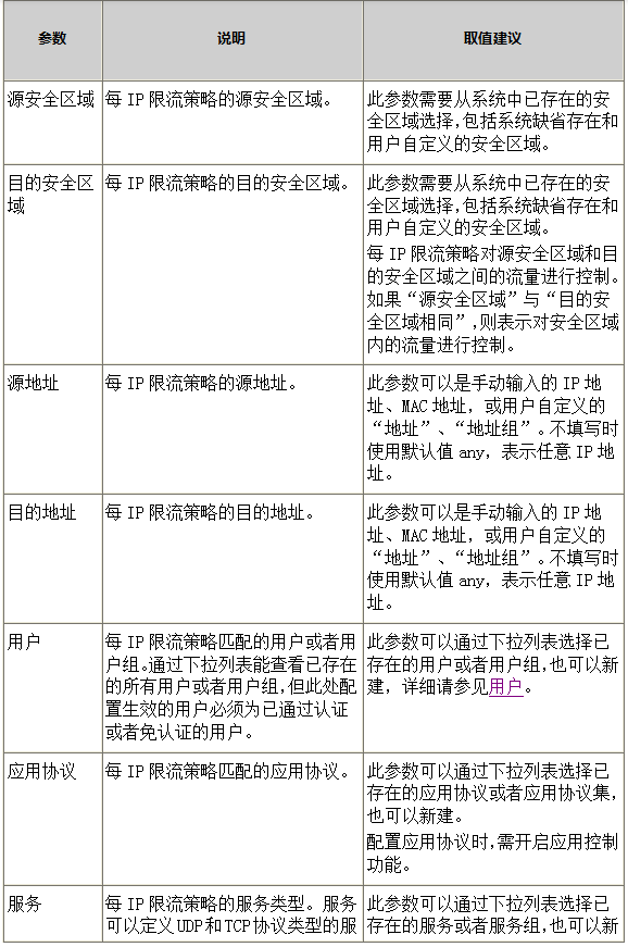 每IP限流策略在匹配流量时,除了“源安全区域”、“目的安全区域”、“动作”和“每IP限流Class”外,其他各种匹配条件均为可选配置。如果配置,则满足所配置的条件的流量才会匹配成功。如果不配置,相当于不对这个匹配条件进行要求。如果所有条件均不配置,相当于匹配所有流量。所有匹配条件中,源IP地址和源MAC地址属于同一类匹配条件,若同时配置,流量只要命中其中一个就能满足这类匹配条件。同理,目的IP地址和目的MAC地址也属于同一类匹配条件。