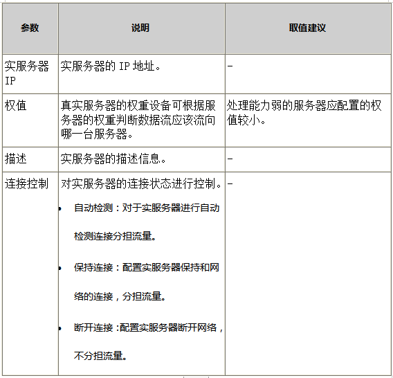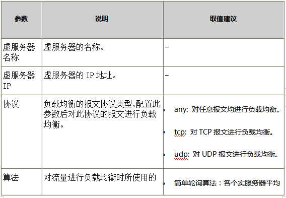 虚服务器必须至少要包含一个实服务器。如果配置的实服务器已被其他虚服务器绑定,则该虚服务器IP必须与其他虚服务器IP一致,且协议和端口号不相同;否则,当该虚服务器IP与其他虚服务器IP冲突时,必须配置协议和端口号使之与其他虚服务器不相同或者更换IP。