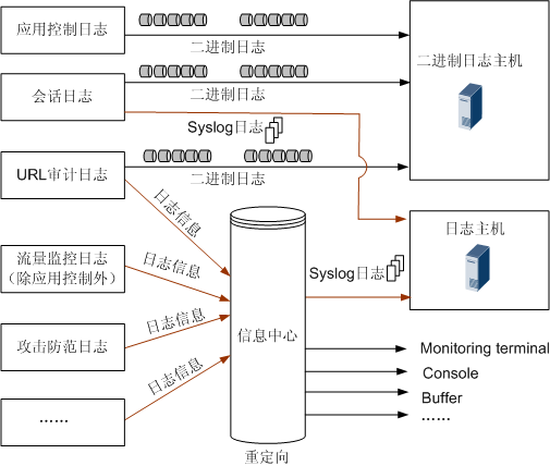 攻击防范、黑名单、流量监控日志(除应用控制日志外)等信息量小的日志和URL审计日志都可采用Syslog方式以文本格式进行传输。这些信息必须通过信息中心模块进行日志管理和输出定向,然后显示在终端屏幕上,或者发送给日志主机进行存储和分析。