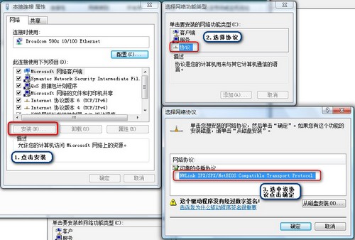 因为Windows 7 操作系统不自带IPX协议,先需要在Windows XP 等操作系统中找到相关协议相关的系统文件,保存到相应的路劲之中,再添加协议才可以。提取文件有多种方式,可以在网上下载【IPX协议】.rar
