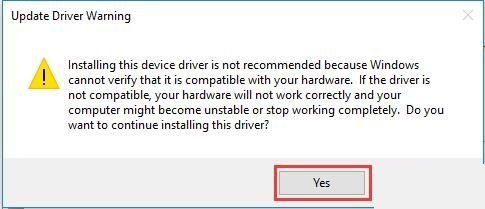 5.单击“ 是”。警告是正常的,因为您将安装兼容的硬件驱动程序。