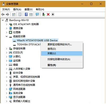 USB设备无法被识别,还可能是设备加载错误或驱动程序出现问题。这时需要卸载设备,然后重新刷新驱动程序。具体方法是,右键单击开始菜单并选择“设备管理器”项,打开设备管理器。找到“磁盘驱动器”下的移动设备,右键单击并选择“卸载”命令(图5)。然后拔出移动设备,重新插上后系统会自动重新加载设备的驱动程序。如果依然不行,可尝试单击右键菜单中的“更新驱动程序软件”选项,让系统自动执行驱动程序的更新。之后回到资源管理器中,看是否识别出了移动设备。
