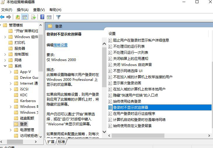 2、然后依次打开【管理模板】-【系统】-【登录】。然后双击右侧的【登录时不显示欢迎屏幕】。