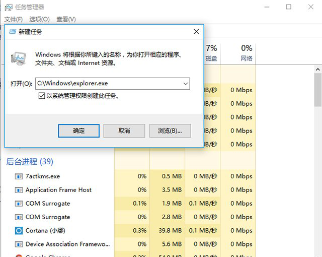 2、再点击任务管理器上“文件” - “运行新任务”,输入“C:\Windows\explore.exe”,并勾选以管理员权限创建此任务(切记一定需要使用管理员权限),如下图所示。
