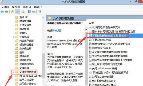 2、在本地组策略编辑器窗口左侧栏中依次展开"用户配置"-"管理模板"-"Windows组件"-"文件资源管理器"中,鼠标单击"文件资源管理器"选中它,在右侧栏中找到"不要将删除的文件移到回收站",并双击打开,如下图所示。