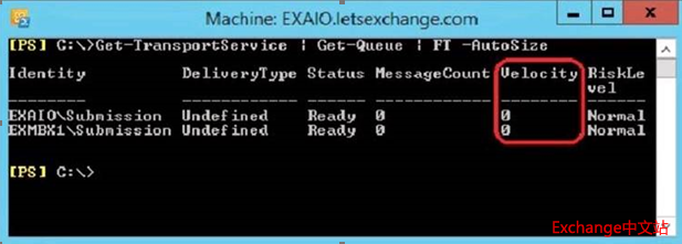 Exchange 2013的管理命令行中输入Get-Queue命令时,你会看见队列有一个速率(Velocity)的属性(这个属性在队列查看器工具中没有):