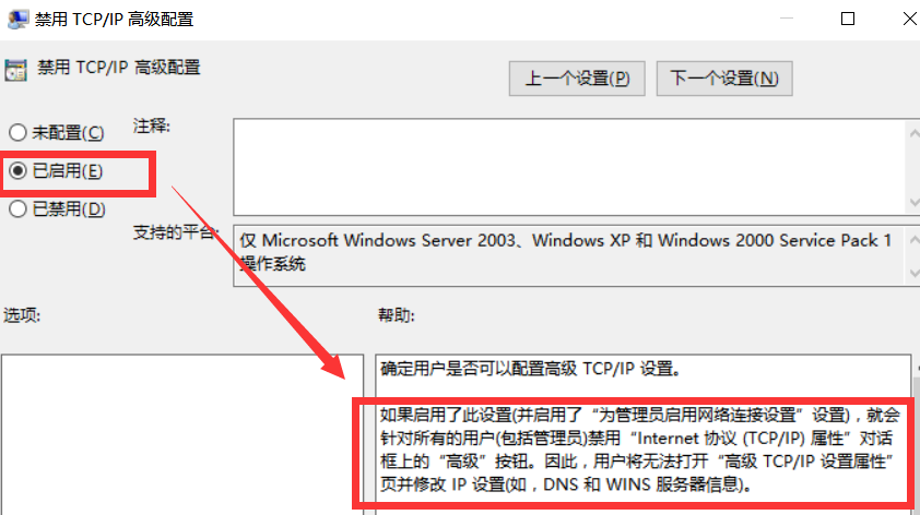 2、此时将弹出如图所示的“禁止TCP/IP高级配置属性“设置界面,勾选”已启用“项,点击”确定“按钮