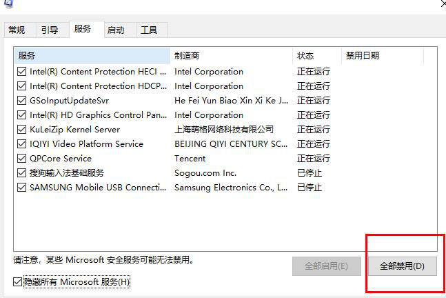 3、点击“服务”,勾选“隐藏所有 Microsoft服务”