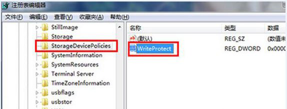 2、在打开的注册表编辑器窗口中依次展开“HKEY_LOCAL_MACHINE\SYSTEM\CurrentControlSet\Control\StorageDevicePolicies”并找到StorageDevicePolicies右侧的WriteProtect键值;