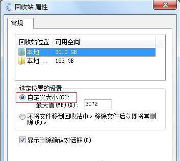 2、在回收站的属性窗口中,我们能够看见每一个盘符有对应的删除文件大小限制,我们点击自定义大小,将最大值修改适合的大小即可,单位为MB(1024MB等于1GB),之后点击确定即可,如下图所示: