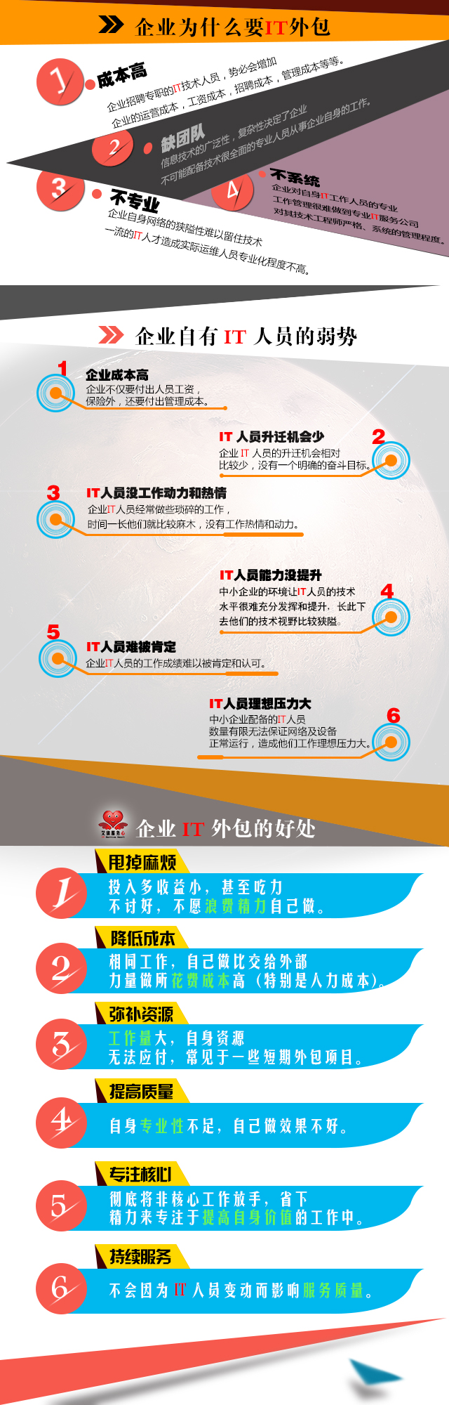2. 我们是整个团队服务以及整个企业为您企业服务,所以如果企业遇到突发事件,比喻说大面积断网,比喻说机房整改,比喻说全员换系统,这样就不会让这个项目影响到企业运营停止或员工工作中断的状况,并且企业没有遇到问题时艾锑人出现的次数就少,只是定期为您做IT系统的检查,企业有事艾锑人出现的频率就高,这样大大降低了企业养一个专职网管的费用,从实际成面上节省了高额成本,并为企业带来了工作效率的提升,从而为企业创造一个更大的价值。