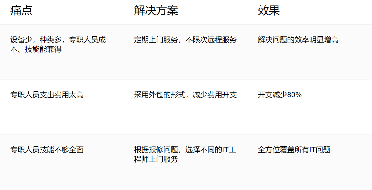 主管:我们的分部本身人员不太多,设备也不太多,之前招聘一个专职人员,薪资、社保、公积金、水电暖、租金、补助等各项开支,一个月的成本大概是1万左右,但是专职人员的专业技能却达不到企业的要求,因为涉及到电脑、打印机、网络、服务器等设备。所以我们采用了外包的形式,不但各项开支节省了,技术能力也得到保证了,何乐而不为呢!