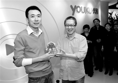 昨日,优酷创始人古永锵(右)、土豆创始人王微(左)亮相优酷总部,安抚员工。