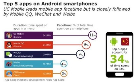 在Android平台上,排名前五的应用一共占据了用户34%的时间。社交类应用占据五席中的三席,使用最为活跃,表现最强劲的是手机QQ、微信和新浪微博。