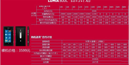 中国电信今日公布了诺基亚Lumia 800C的合约计划,合约购机的套餐最低为49元,289元及以上套餐可零元购机。