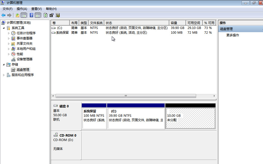现在有两个主分区,一个是系统的100M引导分区,一个是在安装系统时划分的C盘,剩下的10G空间就是本次要划分的扩展分区。