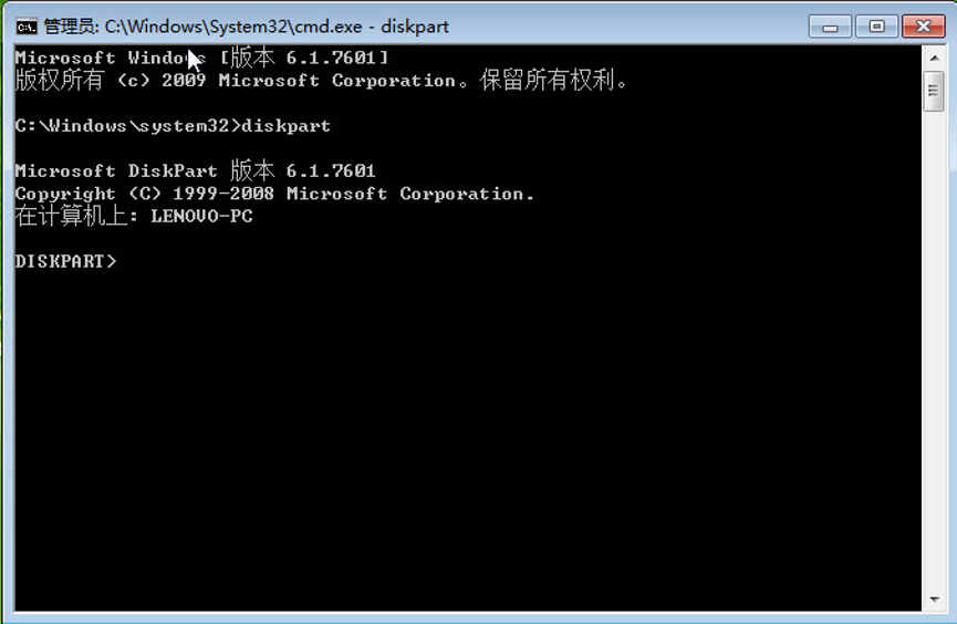 下面会开启命令提示符窗口,请输入diskpart并按回车,打开diskpart磁盘管理工具;