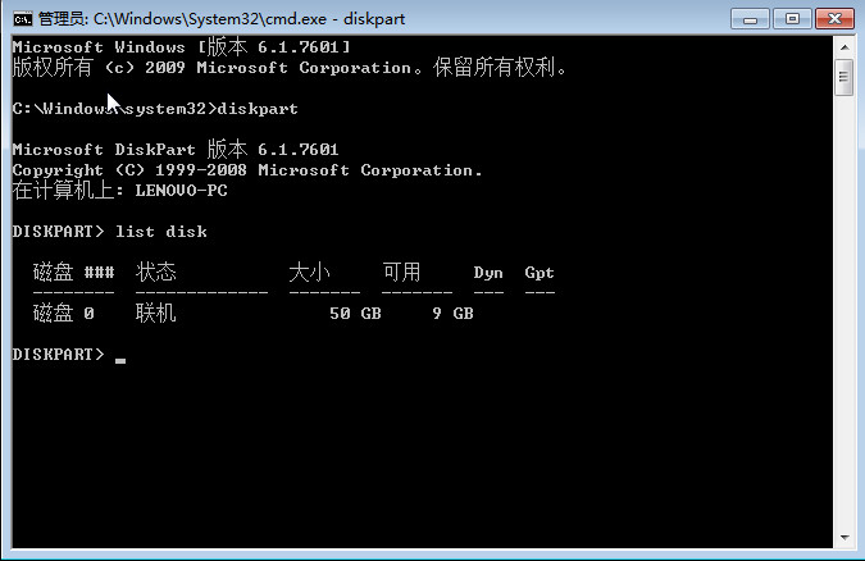 接下来,请输入list disk回车,查看当前的磁盘状况,如下图