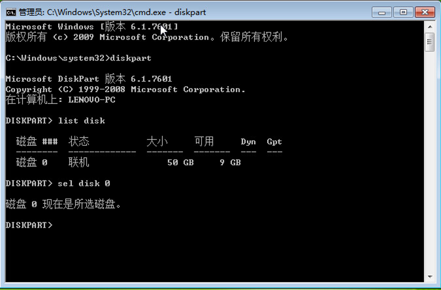 如图所示,50G的磁盘0,就是我们需要执行操作的磁盘,下面输入sel disk 0回车,选中该磁盘,如图: