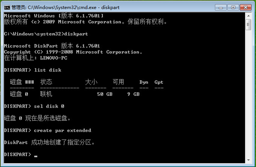 注4:create par extended 把剩下的未划分空间创建为扩展分区(全称create partition extended)