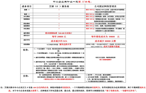 综上所述,一个IT外包服务商能为中小企业提供“合适的解决方案,系统的管理流程,用心的服务标准”那绝对是中小企业的最大福气,不仅能让中小企业脱离信息化建设过程中所遇到的混乱,更能让中小企业快速发展中建立有序的服务体系,让整个服务系统在企业成长中生生不息。艾锑无限360度六纬一体的服务体系更能扫清中小企业IT服务过程中遇到的盲点,最终达到“企中三年艾,其它服务不用来”的最佳效果。