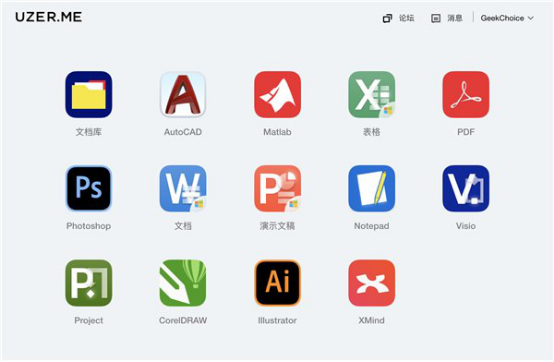 它提供了 Photoshop、Illustrator、AutoCAD、Word、PPT、Excel 等 13 个云应用,你只需要将你的文件上传至「文档库」中即可用这台「云电脑」打开。