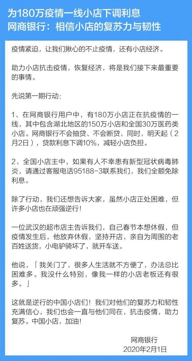 2月1日消息,据悉,蚂蚁金服发起成立的网商银行将从2月2日开始,针对150万湖北小店和正在抗击疫情的30万医药类小店,不抽贷不断贷,尽量避免小店因为资金链突然断裂而“死亡”,并且对利息下调10%,为小店减负。不幸患上新冠肺炎的小店主,可以通过客服电话联系网商银行,从而全额免除利息。