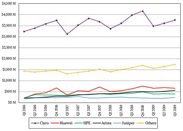 就供应商市场份额而言,公司非常忠于自己的一个或两个交换机供应商。Arista和华为花费了10年时间才超越Juniper,成为仅次于Cisco Systems的第二大收入来源,Cisco虽然在最近几个季度中收入有所下滑,但在市场中仍占据主导地位。IDC直到最近才提供供应商细分,因此暂时看不到Juniper收入的下滑以及华为和Arista的崛起。
