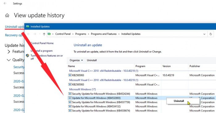 现在,您可以选择要卸载的更新,然后单击“卸载”按钮。
