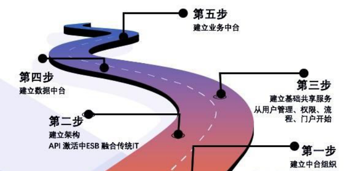 中台的建设不是那么件轻松的事情。首先要建立“中台“配套的相关管理机制,其次是建立应用架构,从相对容易的基础共享服务开始,到定制与业务贴合的业务中台。在建立中台的过程中,需要配套中台运行的后台基础架构。中台的建设可以总结为五步走。