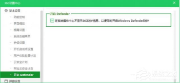 4、勾选“在系统操作中心不显示360防护信息,以便同时开启Windows Defender防护”。