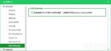以国内用户量很大的“360安全卫士”为例,打开“设置”,在“360设置中心”里就可以看到“开启Defender”设置项。如图: