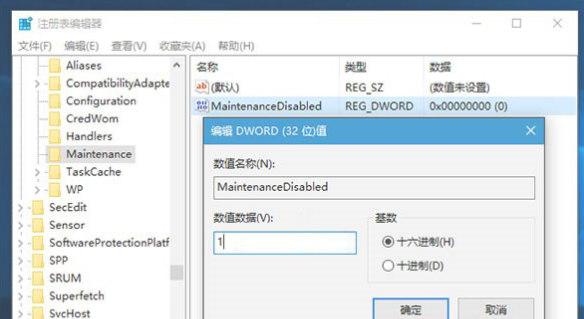 4、双击新建值MaintenanceDisabled,将其值修改为1,保存即可关闭自动维护功能。