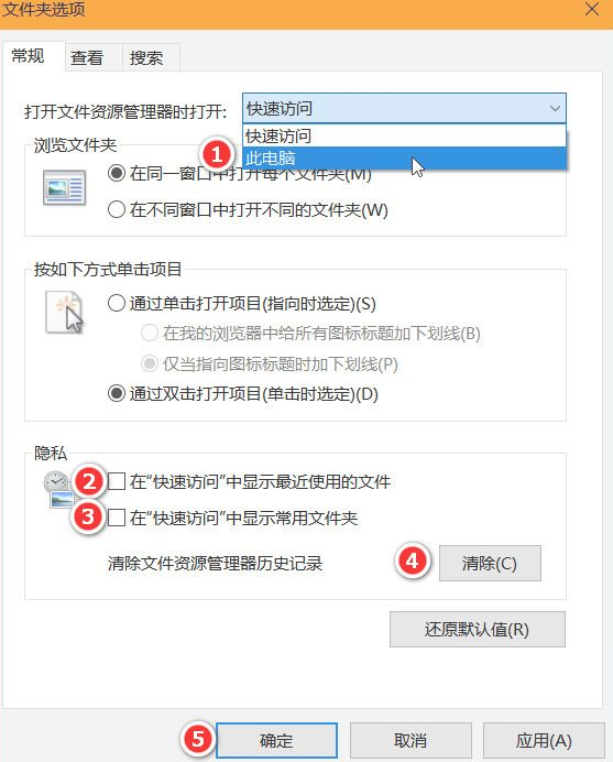 2、按照下图,依次选择“打开文件资源管理器时打开”此电脑,去除在“快速访问”中显示最近使用的文件与在“快速访问”中显示常用文件夹前面的对勾,并点击清除当前记录。最后点击确认或应用即可。