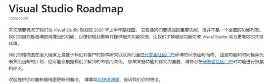 3月1日消息 微软方面公布了其在 2020 年上半年的 Visual Studio 工作计划。并表示,“我们的目标是弄清即将发生的事情,以便您可以计划升级并提供有关哪些功能可使Visual Studio成为您和您的团队更高效的开发环境的反馈”。