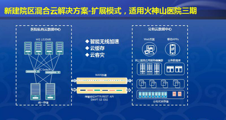 混合云解决方案有三个技术优势,第一个是无线加速,现在大家用无线已经很普及了,第二是云缓存,举个例子,早些年没有4G,网络没有这么发达的时候,大家都是把电影或者电视剧下到本地电脑硬盘上去看,非常快,不会卡,但现在其实基本上都是看在线,医院是24小时服务的,绝对不能出现任何的卡顿和数据不一致。所以需要把公有云上的数据,提前下载下来,保证数据的一致性;第三是云容灾方案,有了私有云之后,会做一个互备,也就是说公有云和私有云两者数据上面都有,各有一份,万一哪个出现问题,可以做恢复或者切换使用。
