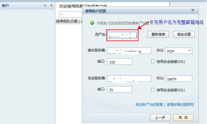 单击下方按钮展开全部内容,输入邮箱账户名(完整的邮箱账号全拼),输入完成进入下一步