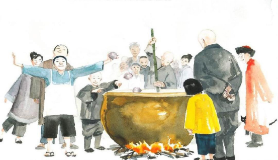 小姑娘帮和尚们在院子里找到了他们所要的石头,他们把石头放在锅子里煮。
