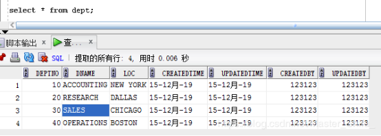 --创建部门表 dept: CREATE TABLE dept ( deptno NUMBER(2) CONSTRAINT PK_DEPT PRIMARY KEY, dname VARCHAR2(14) , loc VARCHAR2(13) , CREATEDTIME DATE, UPDATEDTIME DATE, CREATEDBY NUMBER(7,0), UPDATEDBY NUMBER(7,0) ) ; --创建员工表 emp: CREATE TABLE emp ( empno NUMBER(4) CONSTRAINT PK_EMP PRIMARY KEY, ename VARCHAR2(10), job VARCHAR2(15), mgr NUMBER(4), hiredate DATE, sal NUMBER(7,2), comm NUMBER(7,2), deptno NUMBER(2) CONSTRAINT FK_DEPTNO REFERENCES DEPT, CREATEDTIME DATE, UPDATEDTIME DATE, CREATEDBY NUMBER(7,0), UPDATEDBY NUMBER(7,0) ); --创建员工表 emp_copy: CREATE TABLE emp_copy ( empno NUMBER(4), ename VARCHAR2(10), job VARCHAR2(15), mgr NUMBER(4), hiredate DATE, sal NUMBER(7,2), comm NUMBER(7,2), deptno NUMBER(2), CREATEDTIME DATE, UPDATEDTIME DATE, CREATEDBY NUMBER(7,0), UPDATEDBY NUMBER(7,0) ); --自定义一个序列 create sequence emp_sequence increment by 1 --每次增加几个,我这里是每次增加1 start with 1 --从1开始计数 nomaxvalue --不设置最大值 nocycle --一直累加,不循环 nocache --不建缓冲区 --插入dept表数据: INSERT INTO dept VALUES(10,'ACCOUNTING','NEW YORK',sysdate,sysdate,123123,123123); INSERT INTO dept VALUES (20,'RESEARCH','DALLAS',sysdate,sysdate,123123,123123); INSERT INTO dept VALUES(30,'SALES','CHICAGO',SYSDATE,SYSDATE,123123,123123); INSERT INTO dept VALUES(40,'OPERATIONS','BOSTON',sysdate,sysdate,123123,123123); --插入emp表数据: INSERT INTO emp VALUES(7369,'SMITH','CLERK',7902,to_date('17-12-1980','dd-mm-yyyy'),800,NULL,20,sysdate,sysdate,123123,123123); INSERT INTO emp VALUES(7499,'ALLEN','SALESMAN',7698,to_date('20-2-1981','dd-mm-yyyy'),1600,300,30,sysdate,sysdate,123123,123123); INSERT INTO emp VALUES(7521,'WARD','SALESMAN',7698,to_date('22-2-1981','dd-mm-yyyy'),1250,500,30,SYSDATE,SYSDATE,123123,123123); INSERT INTO emp VALUES(7566,'JONES','MANAGER',7839,to_date('2-4-1981','dd-mm-yyyy'),2975,NULL,20,sysdate,sysdate,123123,123123); INSERT INTO emp VALUES(7654,'MARTIN','SALESMAN',7698,to_date('28-9-1981','dd-mm-yyyy'),1250,1400,30,SYSDATE,SYSDATE,123123,123123); INSERT INTO emp VALUES(7698,'BLAKE','MANAGER',7839,to_date('1-5-1981','dd-mm-yyyy'),2850,NULL,30,sysdate,sysdate,123123,123123); INSERT INTO emp VALUES(7782,'CLARK','MANAGER',7839,to_date('9-6-1981','dd-mm-yyyy'),2450,NULL,10,SYSDATE,SYSDATE,123123,123123); INSERT INTO emp VALUES(7788,'SCOTT','ANALYST',7566,to_date('19-4-87','dd-mm-yyyy'),3000,NULL,20,SYSDATE,SYSDATE,123123,123123); INSERT INTO emp VALUES(7839,'KING','PRESIDENT',NULL,to_date('17-11-1981','dd-mm-yyyy'),5000,NULL,10,sysdate,sysdate,123123,123123); INSERT INTO emp VALUES(7844,'TURNER','SALESMAN',7698,to_date('8-9-1981','dd-mm-yyyy'),1500,0,30,SYSDATE,SYSDATE,123123,123123); INSERT INTO emp VALUES(7876,'ADAMS','CLERK',7788,to_date('23-5-87','dd-mm-yyyy'),1100,NULL,20,sysdate,sysdate,123123,123123); INSERT INTO emp VALUES(7900,'JAMES','CLERK',7698,to_date('3-12-1981','dd-mm-yyyy'),950,NULL,30,sysdate,sysdate,123123,123123); INSERT INTO emp VALUES(7902,'FORD','ANALYST',7566,to_date('3-12-1981','dd-mm-yyyy'),3000,NULL,20,SYSDATE,SYSDATE,123123,123123); INSERT INTO emp VALUES(7934,'MILLER','CLERK',7782,to_date('23-1-1982','dd-mm-yyyy'),1300,NULL,10,sysdate,sysdate,123123,123123); |