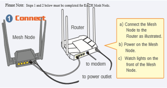 1、将第一个节点(蓝色 WAN 端口)连接到主路由器(黄色 LAN 端口)。