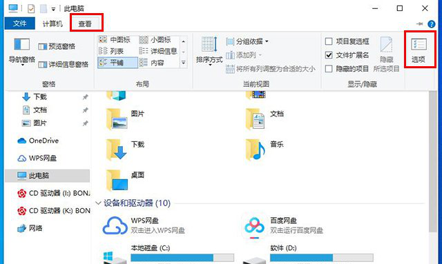 我们打开“此电脑”,点击查看选项卡,再点击“选项”,就可以打开“文件夹选项”了。
