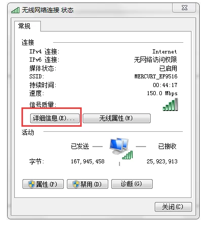 找到连接的无线网后双击,打开无线网络连接状态,再选择“详细信息”。