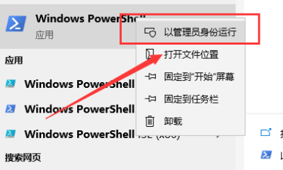 1.同时按下【win】+【s】搜索框直接输入:【Windows Powershell 】,在【Windows Powershell】上单击右键,选择【以管理员身份运行】