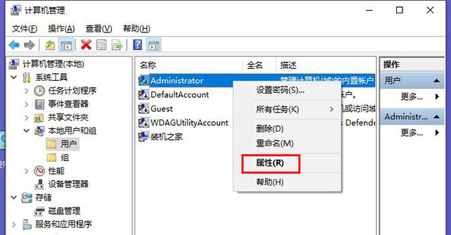 选择本地用户和组,再选择用户,右侧会出现所有的本地用户,其中就包括administrator,鼠标右键点击“administrator”,选择“属性”。