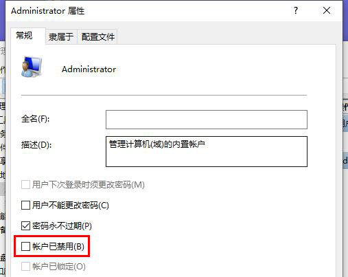 将administrator属性的界面中,将“账户已禁用”勾选去除,就可以启用“administrator”账户了。