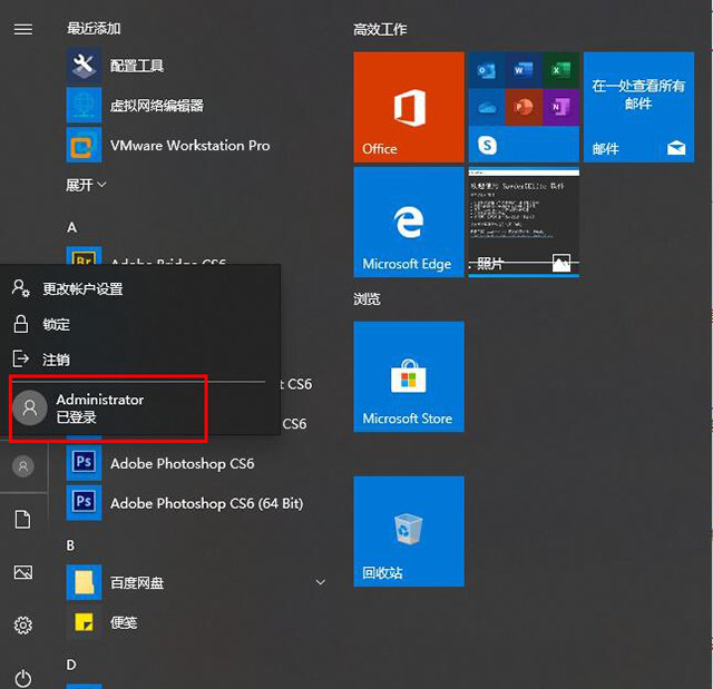 我们点击开始菜单,点击“用户”的人像按钮,选择“administrator”账户进行登录,或者在键盘上按下“Ctrl + Alt + Del”组合键,点击切换用户,切换至“administrator”账户。
