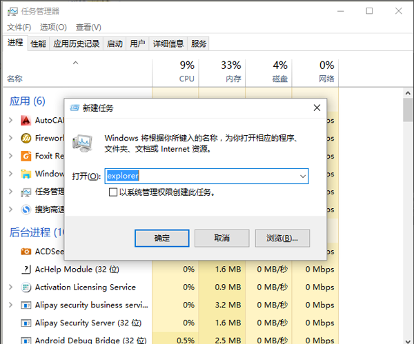 在任务管理器的界面中,我们选择【文件】----【运行新任务】,在运行命令中输入【explorer】,如下图所示;