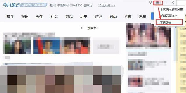 虽然“今日热点”十分流氓,但是也会有人性化的一面,其实在2345“今日热点”弹窗界面出来的时候,我们可以通过点击软件上方的“三”菜单,选择不再弹出,如果下次还会弹出可能是因为你还安装了其它2345相关软件,如果下次还会弹出就再设置几次。